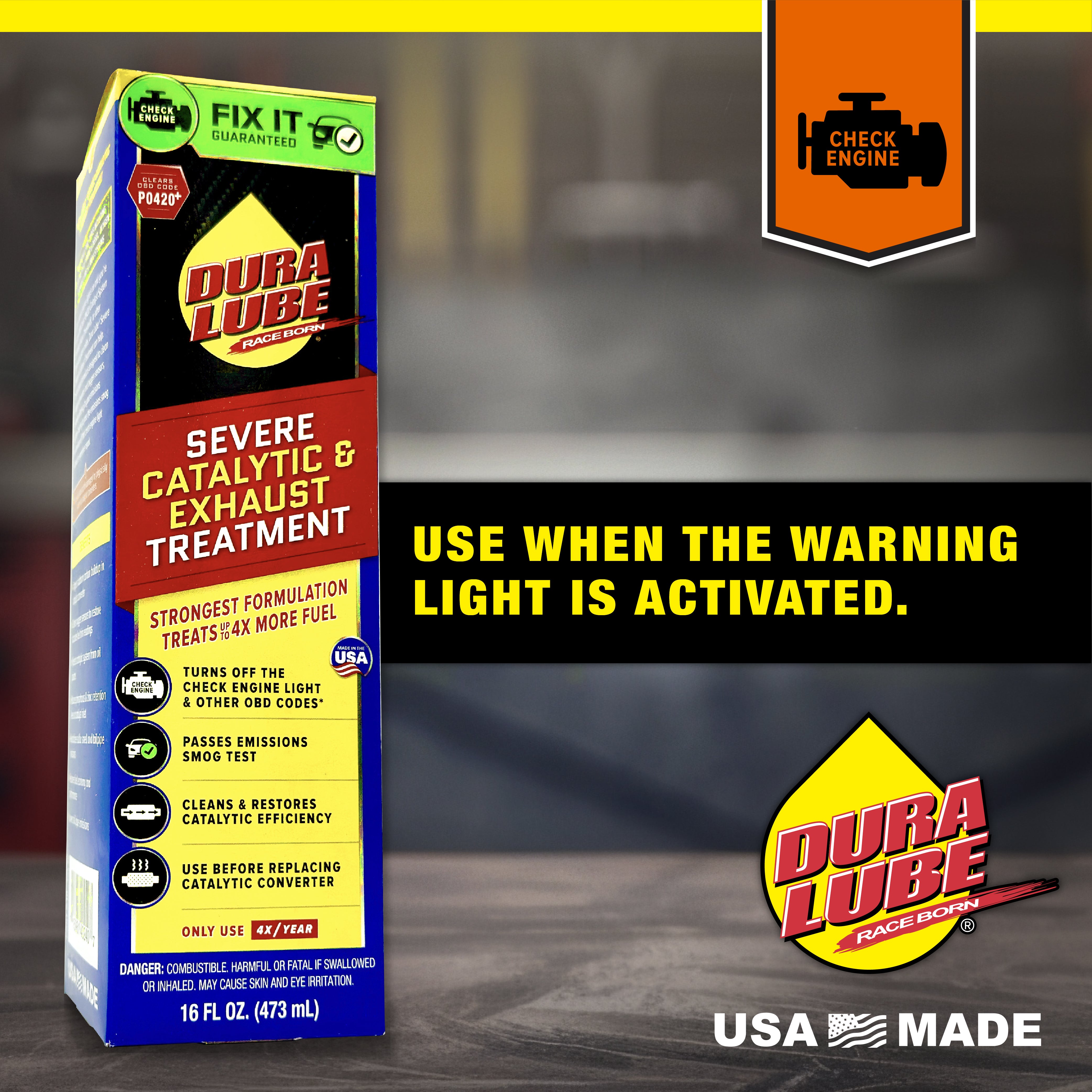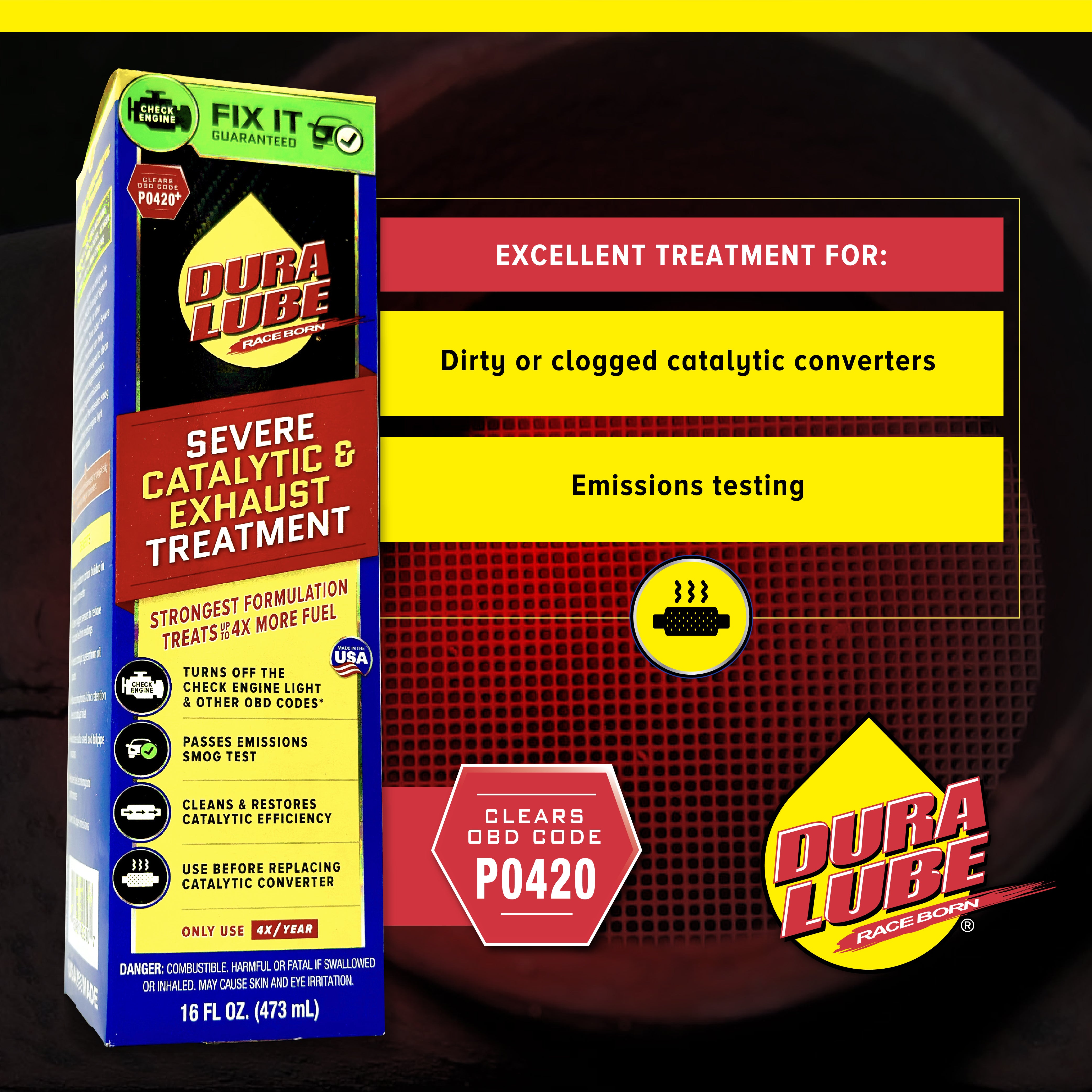 If your check engine light is on and you're seeing OBD code P0420 (Catalyst System Efficiency Below Threshold) or other emissions-related codes, Dura Lube® Severe Catalytic Converter Cleaner & Exhaust System Treatment can help.